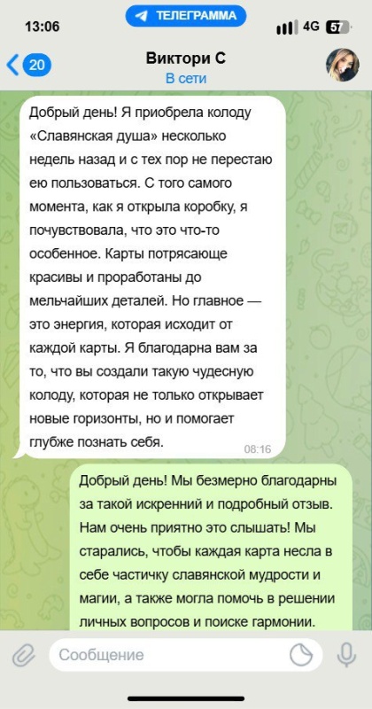 Если вы читаете эти строки, значит уже готовы к переменам. Действуйте, пока ощущаете внутренний импульс. Вы не случайно обратили внимание на колоду «Славянская душа». Возможно, предки направили вас к ней, чтобы поддержать на жизненном пути и передать важное знание.
